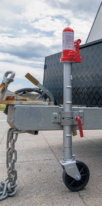 Hydraulic jack that can be transformed into a jockey wheel. Space saving. Heigh raised: 800mm. Height lowered: 160mm.